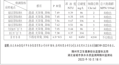 湖北省城市供水水質(zhì)監(jiān)測網(wǎng)隨州監(jiān)測站、隨州市衛(wèi)生健康綜合監(jiān)督執(zhí)法局根據(jù)《城市供水水質(zhì)管理規(guī)定》聯(lián)合于2023年10月17日對隨州市水務(wù)集團(tuán)有限公司先覺廟水廠和封江水廠出廠水和16個(gè)管網(wǎng)末稍水水質(zhì)進(jìn)行了抽樣監(jiān)測,現(xiàn)將抽查檢測結(jié)果公告如下: